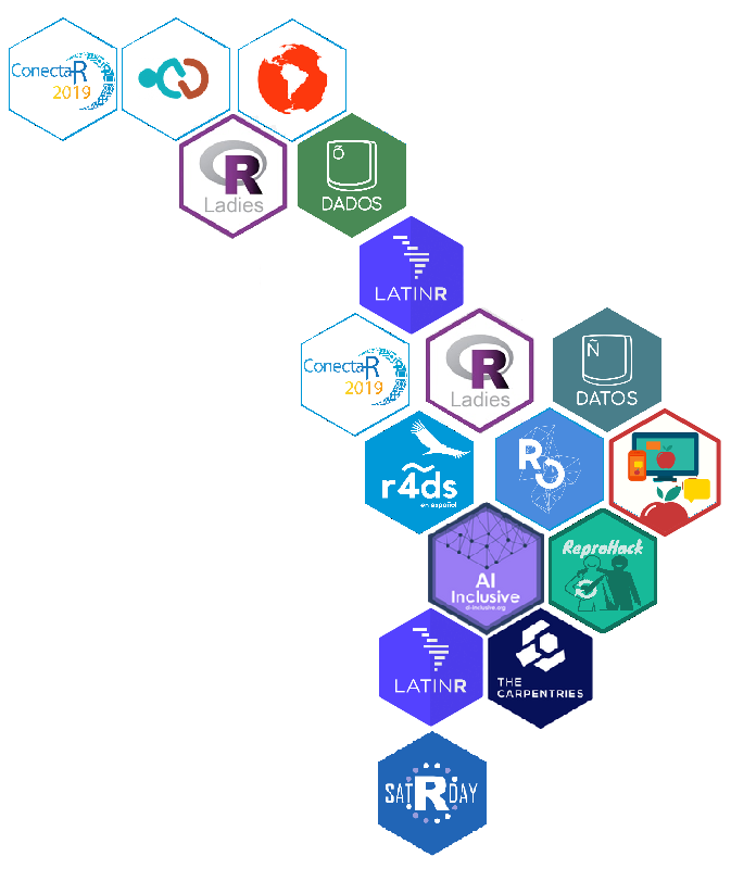 - R-Ladies: R-Ladies es una organización global que promueve la diversidad de género en la comunidad R. Actualmente, tiene 123 capítulos activos en 51 países de todo el mundo, de los cuales en América Latina tenemos 49 capítulos en 10 países. Algunxs latinxs son parte del equipo global de R-Ladies, incluyendo su directiva. COVID-19 no ha detenido a R-Ladies. En cambio, hemos migrado nuestros eventos en línea y hemos creado alianzas entre los diferentes capítulos. Todo ha sido en un esfuerzo para proveer opciones para aprender R en ambientes seguros y de apoyo para así aumentar la diversidad de género en la comunidad de R. ¡Únete!