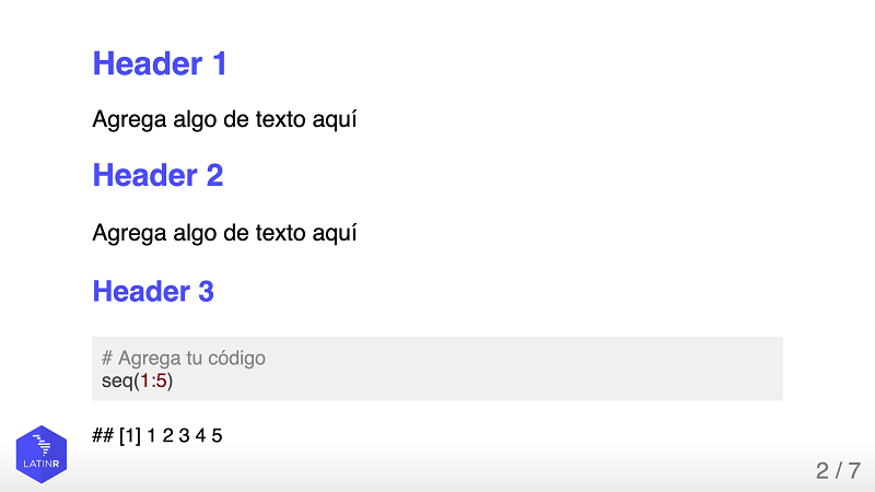 Puedes ver una presentación ejemplo generada con xaringan y el theme latinR en el siguiente link