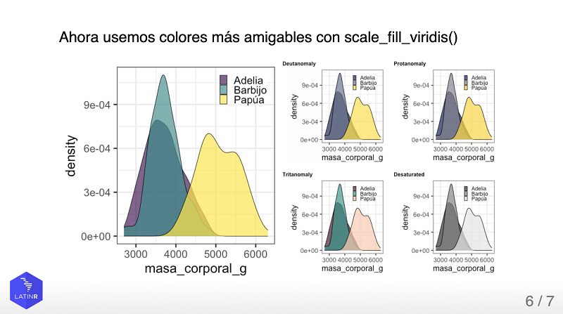 Si deseas incluir gráficos generados con ggplot2, te sugerimos utilizar escalas de color amigables con las personas con dificultades visuales; por ejemplo, la escala viridis.